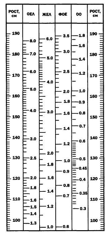 Таблица 30 Уровень гормонов в крови практически здоровых детей 11—15 лет (Кожевникова О. В., 1991) 1 В строке «а» пределы колебаний, в строке «6» — средняя величина. Номограмма для определения должных величин показателей кривой «поток—объем» у детей 6—16 лет Условные об озн а ч е н и я: FVC — форсированная жизненная емкость легких, л; FEV( 0 — объем форсированного выдоха за 1 с, л; FEV0 5 — объем форсированного выдоха за Vi секунды, л; FEV[ o/FVC —' коэффициент Тиффно, %; PEF.— пиковая скорость' выдоха, л/с V25 — скорость потока в точке 25 % FVC, л/с Vso — скорость потока в точке 50 % FVC, л/с Vys ~ скорость потока в точке 75 % FVC, л/с V25_75 — скорость потока в интервале 25—75 % FVC, л/с; V75-85 — скорость потока в интервале 75—85 % FVC, л/с; МТТ — среднее транзитное время выдоха FVC, с; TGES — общее время выдоха, с; А[ЕХ] — площадь кривой «поток—объем», л2/с Номограмма для определения должных величии легочных объемов Условные обозначения: ОЕЛ — общая емкость легких, л; ФОБ — функциональная остаточная емкость легких, л; ОО — остаточный объем, л. Номограмма для определения должных величин показателей функции внешнего дыхания у мальчиков 4—16 лет Условные обозначения: ЖЕЛ — жизненная емкость лепосс, л; МП — мертвое пространство, мл; ОФ1>1 — объем форсированного выдоха за 1 с, л; МВЛ — максимальная вентиляция легких, л; ИТ — индекс Тиффно, %; ДСЛ — диффузионная способность легких, мл (мин • мм рт. ст.)"1; ПС — пиковая скорость вдоха, выдоха, л/с. Номограмма для определения должных величин показателей функции внешнего дыхания у девочек 4—16 лет Условные обозначения: ЖЕЛ