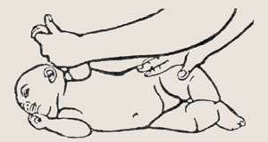 1. Согните ножки малыша в тазобедренных и коленных суставах, сомкните их, сблизив голени. Ваш большой палец придерживает колено, а четыре пальца сбоку обхватывают таз ребенка. Расположив таким образом свои руки на ножках малыша, выполните повороты таза в стороны. Повторите по 10 раз в каждую сторону. 2. Левую руку и правую ногу младенца поочередно сгибайте и разгибайте 10 раз. Затем проделайте то же самое с его правой рукой и левой ногой. 3. Разведение ног в тазобедренных суставах. Повторите 10 раз. Ваши усилия, преодолевающие сопротивление ребенка, должны быть умеренными. У детей это упражнение — не из любимых. Внимание! Детям с дисплазией тазобедренных суставов выполнять упражнения для ног можно только с разрешения врача-ортопеда. Повороты со спины на живот И. п. — на спине. Ваш помощник поднимает вверх правую ручку ребенка и удерживает ее в таком положении. Вы берете левую ручку малыша в свою левую руку, а правой держите правое бедро ребенка. Помощник прижимает к столу ладонь правой вытянутой руки ребенка, расправляя пальчики. Вы перекидываете его левую ножку через правую, и малыш поворачивается на животик. Сделайте по 10 поворотов вправо и влево.