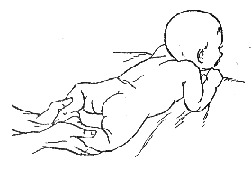1. “Ползание”. И. п. — ребенок в положении на животе. Следует приподнять туловище ребенка на 5—10 см, при этом полусогнутые ноги ребенка должны отталкиваться от ладони взрослого.