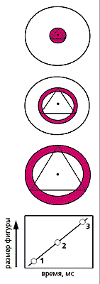 Гипотетическая связь размера опознаваемых треугольников с ходом распространения альфа-волны (показана цветом) и с последовательностью ее фаз (внизу). По гипотезе Питса и Мак-Каллока, волна движется из центра коры к периферии, последовательно считывая информацию о зрительном образе. Поэтому мелкие фигуры должны опознаваться раньше других (фаза 1), а крупные — позже всех (здесь фаза 3).