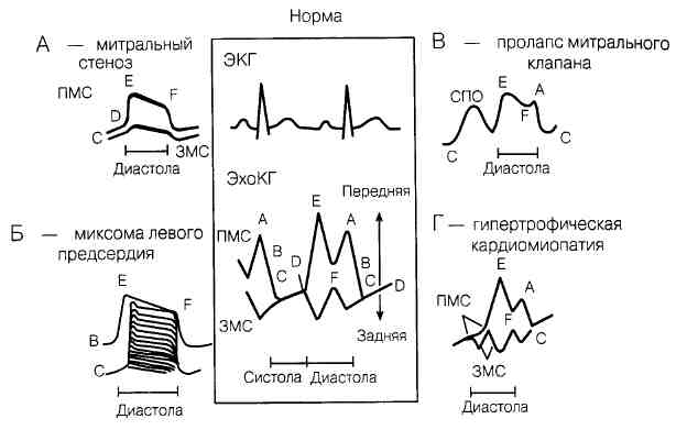 Рис. 74-4. Острый инфаркт миокарда нижней стенки. 29.11 — на ЭКГ виден незначительный, неспецифический подъем сегмента STu изменения зубца Т. 5.12 — острый инфаркт миокарда. Имеются патологические зубцы Q (1), повышен сегмент ST (2), инверсия зубца Т (3) в отведениях II, III и aVF, что указывает на инфаркт в области нижней стенки. Реципрокные изменения в aVF (маленькая стрелка). Увеличение вольтажа зубца R с депрессией ST и увеличение зубца TeV2 характеризуют истинное расширение задней стенки при инфаркте в области нижней стенки. (Воспроизведено из Myerburg RJ.: ЯР/M—13). ИНФАРКТ МИОКАРДА (рис. 74-3 и 74-4) Инфаркт миокарда (ИМ) с изменениями зубца Q. Патологические зубцы Q (> 0,04 и > 25 % от высоты QRS в отведениях представлены в табл. 74-1. Другая разновидность ОИМ характеризуется изменениями интервала ST-Тъ этих отведениях без изменений зубца Q. ST-T • Подъем ST: ОИМ, коронарный спазм, перикардит (ST выпукл остью вверх), аневризма левого желудочка. • Депрессия ST: влияние дигиталиса, наследственная особенность (вследствие гипертрофии желудочка), ишемия или нетрансмуральный ИМ. • Высокие Т: гиперкалиемия, острый ИМ («сверхострый Г»). • Отрицательный Т: ИМ без зубца Q, врожденная особенность структуры желудочка, влияние медикаментов (дигиталис), гипокалиемия, гипокальци-емия, повышение внутричерепного давления (субарахноидальное кровотечение). Показания к эхокардиографии (рис 74-5) Стеноз клапана С помощью допплерэхокардиографии определяют как врожденный, так и приобретенный стеноз клапана, а также степень его тяжести [градиент пиковой скорости = 4 х (пиковая скорость)2]. Клапанная регургитация Могут быть идентифицированы структурные изменения (например, патолога-чески подвижная створка, вегетация), приводящие к регургитации. ЭхоКГ демонстрирует функцию желудочка. Допплерэхокардиография (рис. 74-6) может распознать и оценить степень регургитации через каждый клапан. Характеристика желудочка Определяют общие и региональные патологические колебания стенок обоих желудочков, визуализируют их гипертрофию или инфильтрацию, обнаруживают доказательства легочной гипертензии. Кардиальный источник эмболии Могут быть обнаружены тромб предсердия или желудочка, интракардиальные опухоли и вегетации клапана. Результативность определения кардиального источника эмболии низка при отсутствии анамнеза или физикальных данных. Для этой цели более чувствительна чреспищеводная эхокардиография. ![]() Рис. 74-5. Схематическое изображение регистрации колебания передней (ПМС) и задней (ЗМС) створок митрального клапана в норме с помощью М-эхокардиографии (ЭхоКГ) представлено в центре, с синхронно записанной ЭКГ. Изображены также патологические митральные ЭхоКГ, регистрирующиеся при митральном стенозе (А), миксоме левого предсердия (Б), ПМК (В) и обструктивной ГКМП (Г). На ЭхоКГ пик А указывает на завершение колебаний передней створки митрального клапана в результате сокращения левого предсердия, сегмент CD отображает позицию закрытых створок митрального клапана во время систолы желудочка и пик Е показывает завершение колебания передней створки митрального клапана, когда последняя открывается. Наклон EFобусловлен задним колебанием передней створки митрального клапана в период быстрого наполнения желудочка. При обструктивной гипертрофической кардиопатии СПО представляет систолическое колебани