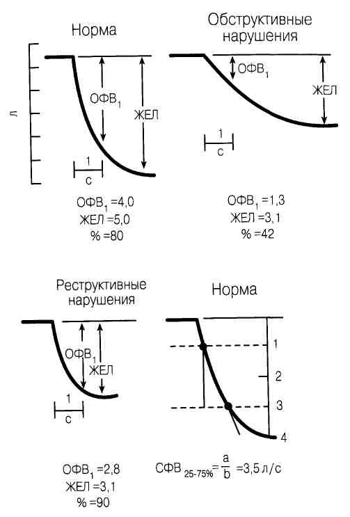 Рис. 87-1. Определение объема форсированного выдоха за 1с (ОФВ), жизненной емкости легких (ЖЕ/7) и средней скорости форсированного выдоха (СФВ 45- 75 %) Больной делает полный вдох и затем выдыхает так сильно и быстро, как только возможно. Когда пациент выдыхает, перо движется вниз. ОФВ - объем воздуха, выдыхаемый в 1 с, ЖЕЛ - общий объем выдыхаемого воздуха. СФВ 25-75% - средняя скорость потока выдыхаемого воздуха. Обратите внимание на различия между нормальным, обструктивнымирестриктивным вариантами. Таблица 87-1 Классификация заболеваний